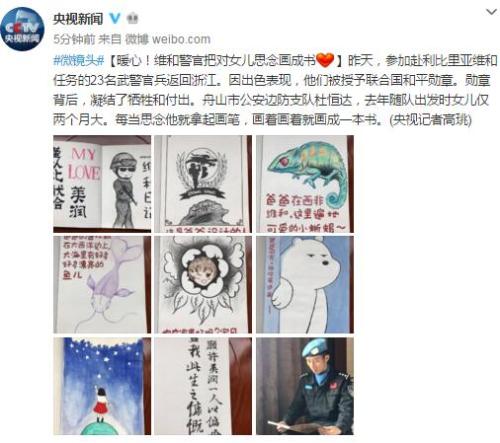 【暖心!维和警官把对女儿思念画成书】昨天,参加赴利比里亚维和任务的23名武警官兵返回浙江。因出色表现,他们被授予联合国和平勋章。勋章背后,凝结了牺牲和付出。舟山市公安边防支队杜恒达,去年随队出发时女儿仅两个月大。每当思念他就拿起画笔,画着画着就画成一本书。(央视记者高珧)