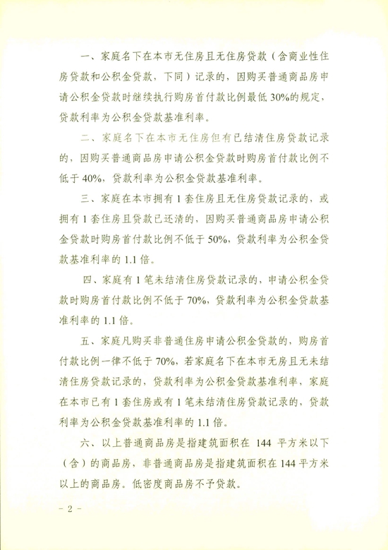 家庭在本市拥有1套住房且无住房贷款记录的,或拥有1套住房且贷款已还清的,因购买普通商品房申请公积金贷款时购房首付款比例不低于50%,贷款利率为公积金贷款基准利率的1.1倍。