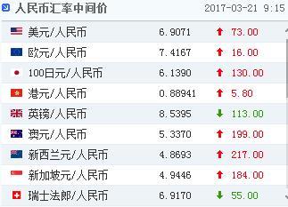 中国人民银行授权中国外汇交易中心公布,2017年3月21日银行间外汇市场人民币汇率中间价为:1美元对人民币6.9071元,1欧元对人民币7.4167元,100日元对人民币6.1390元,1港元对人民币0.88941元,1英镑对人民币8.5395元,1澳大利亚元对人民币5.3370元,1新西兰元对人民币4.8693元,1新加坡元对人民币4.9446元,1瑞士法郎对人民币6.9170元,1加拿大元对人民币5.1764元,人民币1元对0.63882马来西亚林吉特,人民币1元对8.3006俄罗斯卢布,人民币1元对1.8305南非兰特,人民币1元对161.68韩元,人民币1元对0.53158阿联酋迪拉姆,人民币1元对0.54276沙特里亚尔,人民币1元对41.5925匈牙利福林,人民币1元对0.57526波兰兹罗提,人民币1元对1.0027丹麦克朗,人民币1元对1.2777瑞典克朗,人民币1元对1.2279挪威克朗,人民币1元对0.52382土耳其里拉,人民币1元对2.7512墨西哥比索。