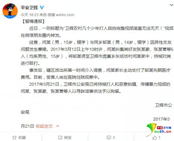 3月21日下午河南新乡卫辉警方发布通报称,近日,一则标题为“卫辉农村几个少年打人自拍完整视频简直无法无天!”视频在微信朋友圈内转发。