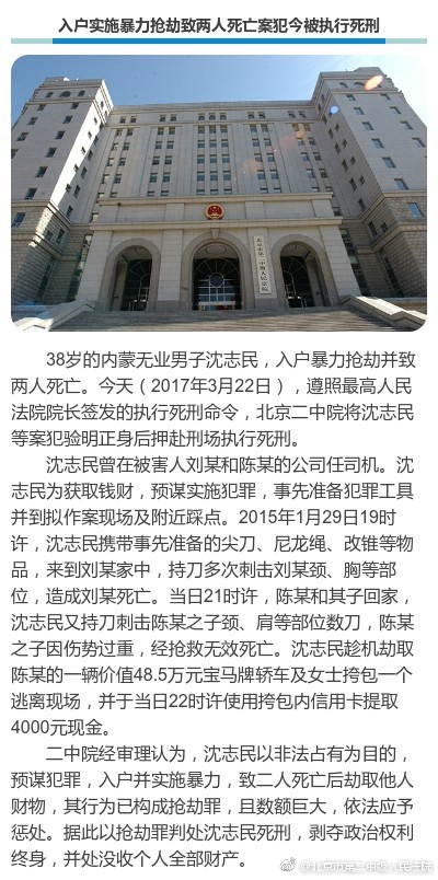 中新网3月22日电 据北京市第二中级人民法院官方微博消息,38岁的内蒙无业男子沈志民,入户暴力抢劫并致两人死亡。今天,遵照最高人民法院院长签发的执行死刑命令,北京二中院将沈志民等案犯验明正身后押赴刑场执行死刑。