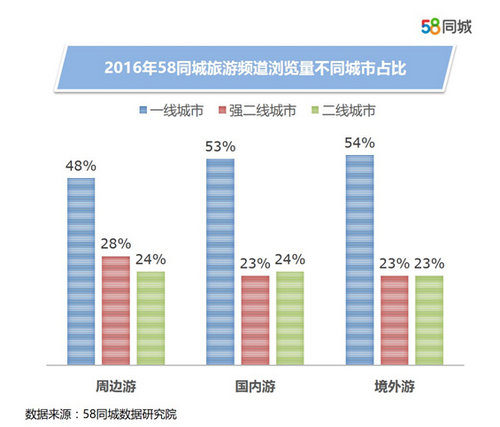 根据58同城的大数据也显示,北上广深的居民对旅游的热情远远超过其他城市,在周边游的浏览量中,北上广深一线城市占比达到48%,像杭州、大连这样的强二线城市的占比仅为28%,普通二线城市则只有24%。旅游在一线城市居民这里已经形成了常态消费,但在二线城市这里还没有形成风尚。