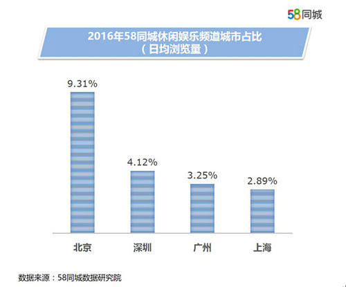 在2016年58同城的休闲娱乐频道城市占比中,四大一线城市占比均超出了二线城市,上海占比2.89%,广州占3.25%,深圳占比4.12%,四大一线城市选择最多的三种休闲方式高度一致,都是运动健身、洗浴温泉、足疗按摩,可见在繁忙的快节奏工作之余,一线城市居民主要通过这样的方式去放松自己疲惫的身心。这其中,最懂得享受的人群无疑是北京居民,日均浏览量占比竟达到了9.31%。这或许和北京作为文化中心,有着丰富的休闲娱乐场所有关,乐活或许正是北京城市的一种特有气质。
