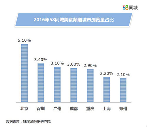 在58同城的大数据中,热爱休闲娱乐的北京居民再次领跑,在美食类浏览量中占比达到5.1%。可见包容的城市文化带来了多元的饮食文化,使北京这个城市南北风味、各色美食不断发展,饮食需求旺盛。而同样作为川菜重镇,成都、重庆两个二线城市的居民表现出了对美食的巨大热情,赶超了作为一线城市的上海,在美食消费上的占比分别达到了3.0%和2.9%,而郑州、济南这些城市和上海相比,也无明显差异。