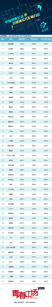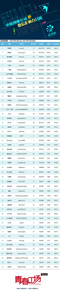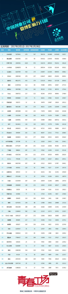 附:2月榜单综合排名TOP50及微博、微信TOP50子榜,欢迎广大创业公司关注