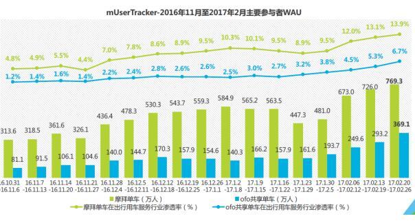 送礼毫不手软,体验炫酷贴心,摩拜单车自然极容易赢得用户的衷心青睐。权威市场调研公司艾瑞咨询今天发布的《2017中国共享单车行业研究报告》显示,今年2月20日至26日这一周,摩拜单车的出行服务渗透率已达13.9%,相当于行业第二名ofo共享单车的2.1倍,稳居行业主导地位,是国内最受欢迎的共享单车服务。