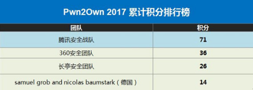 首日积分榜冠军腾讯安全战队在Pwn2Own2017第二日的比赛中首战告捷。由腾讯安全联合实验室和电脑管家攻防小组组成的腾讯安全Sniper战队继昨日完美攻破Adobe Reader后,今日再次以3秒成功“碾轧”Adobe Flash,成功破解并获得系统权限,获得次日首个12分项目。据悉,去年,腾讯安全战队也曾攻破Adobe Flash,创造了Pwn2Own史上最短时攻破的新纪录。