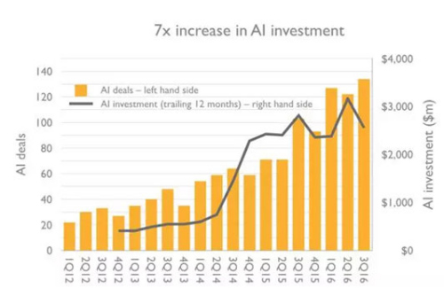 在过去的五年中,公众对人工智能的兴趣增加了6倍,风险投资对人工智能公司的投资数量也进一步增加。我们已经进入了一个良性循环,机器学习的进步可以吸引投资、创业和关注,而后者又进一步推动了机器学习的进展。