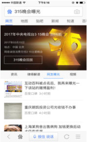 作为世界最大的中文搜索引擎,每年都会有大量的用户通过百度检索315的曝光信息。而今年,消费者在315当天百度“315”时却得到了与以往不同的结果:除位居首条的资讯直播外,紧随其后的是百度口碑的“曝光”页面,用户不仅可以直接在上面了解晚会资讯、曝光商家,还可以免费咨询律师维权常识。用网友的话说就是“不仅为消费者提供了了解信息的资讯入口,更为维护消费者权益提供了便捷的路径!”。