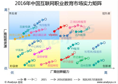 近日,易观发布了《中国互联网职业教育市场专题研究报告2016》,报告指出,2016年,中国互联网职业教育市场规模在整体互联网教育市场中占30.2%,用户参加职业教育目的明确、主动性强、付费意愿高,市场潜力巨大。以外语培训、会计培训、公务员考试、IT技能培训等为主的领域发展较为成熟。其中,vipabc凭借优质的师资和领先技术,成为外语培训领域的典型代表。