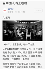 我们的《看历史》从创刊以来一直在坚持“用轻松的方式讲严肃的历史”的行文风格。点来我们的每篇文章,不难发现我们不仅是在以一种轻松的方式讲历史,每篇文章都会有我们自己的观点、思考和感悟,比如我们近期推出的文章《当中国人喝上咖啡》。因此在万千文章中出类拔萃,独树一帜,形成自己的“风格”尤为重要。风格是内容的心灵,独特的行文风格不仅能更好的吸引读者,还能与读者更好的进行交流。