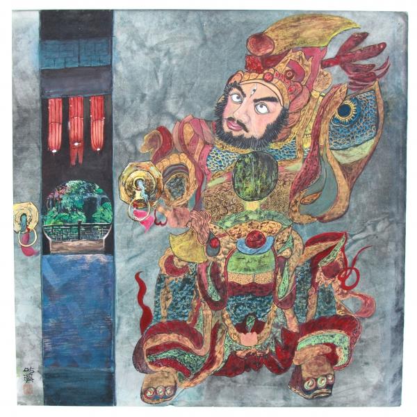 画中的空间之美,既不是传统中国画里那种高远、深远、平远的空旷感,也不是西方写实绘画里符合透视关系的距离感,其作品是由一张张充满历史厚重感的“门”构成实实在在的体量,与空间形成有趣的虚实对比。在《佑平安》、《观变幻》等作品中,张健营造了一种“门内有门、画中有画”的虚实空间。正是在这种虚虚实实的空间里,远近不等的景物相互拉近了距离,在同一个平面里,经过画家巧妙的艺术处理,画面的纵深被拉长,那些忽明忽暗、或近或远的事物有序地排列着。作者有意在方形的门的背后,间或安插一些圆形、穹形的事物,总体上形成平直交错的视觉关系,构成了富有几何意味的构成之美。