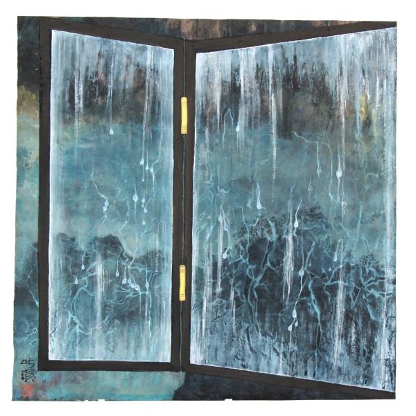 在《观变幻》这幅画中,画家用线条将画面分割成大小不等的区域,形成画面富有变化的形式感。“笔墨”主要呈现为块、面的样式,但是用笔很轻松,使整体画面毫无板结、闭塞之感。玻璃上弥漫了滑落的水珠和飘荡的雾霭,使玻璃门外的世界在扑朔迷离之中若隐若现,犹如缥缈虚幻的海市蜃楼。有趣的是,画家借助透视关系,大胆地把门窗处理成向中间倾斜,加之四周流动的水注,形成了画面的动感。画家已经不再为所表现的对象所束缚,不为物所役,而获得了很大的主动和自由,这标志着,她已经找到了自己特有的表现样式。