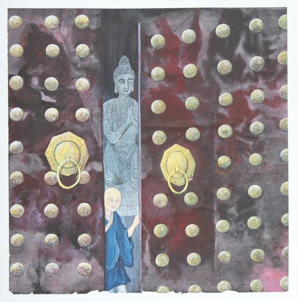 《佛门》则是一幅强调意境的作品。在这幅画中,张健采用了与上述不同的另一种表现手法。画面上,首先是施加色彩,把墨与色有机地融合起来,运用渲染、晕染等手法呈现出旧寺庙的这张古门沧桑、庄严而又神圣的气质。其次,添加新的事物让画面的主题变得丰富起来。这幅画中,作者不仅仅只是描绘门,还描绘了门的背后一尊影影绰绰的佛像,以及探出大半个身子、用惊奇目光打量这个世界的一位僧侣。门的内涵在这幅画中变得更加丰富和深化,佛门,空门,智慧之门,这样一来,画面因有了故事而变得格外生动。