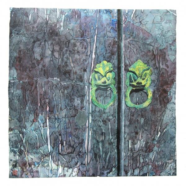 此后,画家作品的表现形式更趋于自由化,但画家并不使之自由到极端,仍保持着一定的具象成分,总体画面也更加单纯和统一,又不失丰富与充实。作者注意对门的整体把握,主要以门的材质、门锁的细节为表现对象,而将其周边的事物避开、舍去或简化,表现手法则采用点、染、晕、泼墨、留空等多种手段,以适用于所表现对象的需要。至此,张健中国画“门”系列作品特有的表现手法基本形成,这是与传统“笔墨”不同的一种绘画语言。