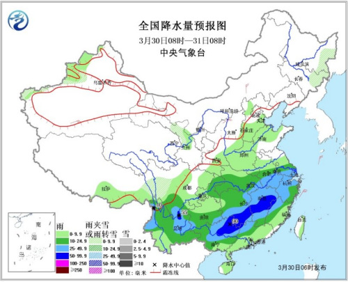 30日08时至31日08时,黑龙江东部、甘肃中部等地的部分地区有雨夹雪,新疆西北部、华北南部、黄淮西部、西南地区大部、江淮、江南、华南大部等地有小到中雨,其中,云南中东部、湖南南部、江西大部、浙江中西部、福建西北部、广西中东部、广东北部等地的部分地区有大雨或暴雨(50~90毫米)。内蒙古中部、华北西部等地有4~6级风。