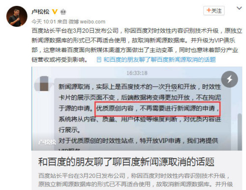 知名站长卢松松撰文解读:这意味着百度面向新媒体渠道方面做出了主动变革,也意味着部分产业链营收或将受到影响。这是一个老的时代的结束,但更是一个新时代的开始。