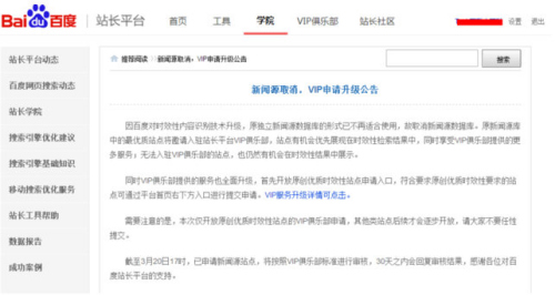百度站长平台在3月20日发布公告,称因百度对时效性内容识别技术升级,原独立新闻源数据库的形式已不再适合使用,故取消新闻源数据库,并升级为VIP俱乐部。