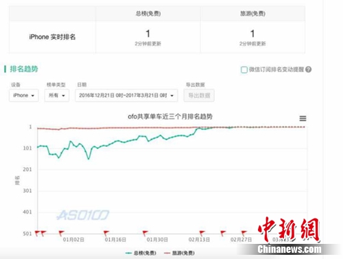 苹果App Store下载排行数据显示,进入2017年,ofo共享单车App Store排名劲增。从500名到100名用时60天,100名到20名用时30天,20名到5名用时10天,5名到榜首仅用5天,同名次分段增长速度达到行业第二名的8倍。从第500名到第1名仅花3个月时间,创造了共享单车行业增速的历史纪录。