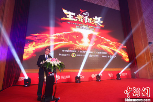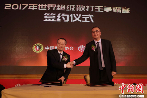 中新网3月26日电 3月25日,2017年世界超级散打王争霸赛(WKA Kungfu King of the World)签约仪式暨新闻发布会在京举行。中国武术协会、国武时代国际文化传媒(北京)有限公司共同签署了2017年世界超级散打王争霸赛合作协议,并宣布2017年世界超级散打王争霸赛将于10月28日开赛。