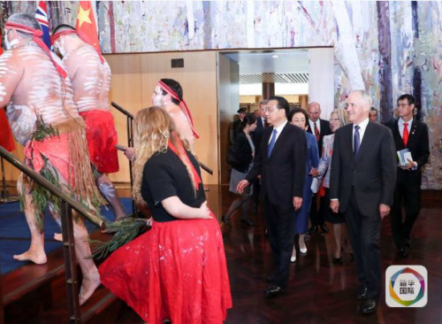 澳大利亚是克强总理此访第一站。3月22日深夜抵达澳首都堪培拉后,当地时间23日中午,克强总理在堪培拉议会大厦出席澳大利亚总理特恩布尔举行的欢迎宴会并发表致辞。当克强总理步入宴会大厅时,传统装扮的澳大利亚土著人踩着传统音乐鼓点,以传统舞蹈欢迎远道而来的中国贵宾。