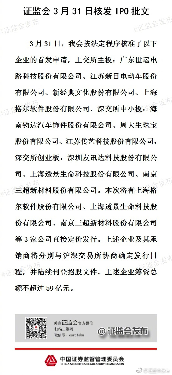 中新网3月31日电 据中国证监会办公厅新闻办官方微博消息,3月31日,证监会核发10家企业IPO批文。其中,上交所主板4家,深交所中小板3家,深交所创业板3家。10家企业筹资总额不超过59亿元。