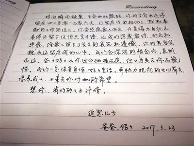 “时间瞬间凝聚,生命如此脆弱。你的生命永远停留在四十岁零一百零六天,停留在你积极向上、默默奉献的工作岗位上。你突然离家人而去,你走得太匆忙,未来得及留下任何只言片语,让我们深感震惊、打击和悲痛,给家人留下了长久的哀思和遗憾。你的音容笑貌永远留在我们心中。我们会深深地惦念你,直到永远。爸爸妈妈以你因公牺牲而荣,但又为失去你而惋惜。我们一定保重身体,好好生活,并协力把你的女儿带大,培养成人,不辜负你对她的希望。想你,我们的儿子许峰。”