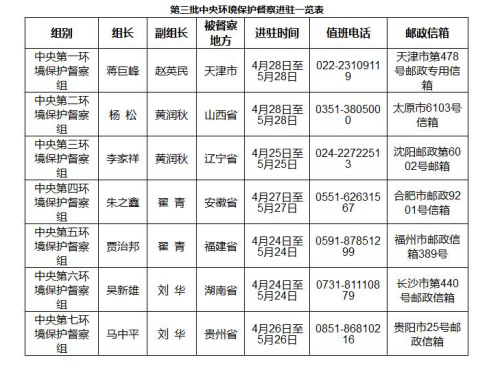 中新网4月28日电 据环境保护部网站消息,经党中央、国务院批准,第三批中央环境保护督察工作全面启动,已组建7个中央环境保护督察组,分别负责对天津、山西、辽宁、安徽、福建、湖南、贵州等7个省(市)开展环境保护督察工作。截至4月28日,7个中央环境保护督察组已全部实现督察进驻。