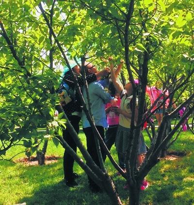昨天下午,在北京园博园里,有人在观赏美景之余采花摘果。尽管当时园内樱桃树上的樱桃尚未成熟,但有不少人已经聚集在树旁,这些人并非为了欣赏植物,而是为了摘取树上并未完全成熟的樱桃。在园博园内的一棵樱桃树旁,一个小孩趁着家长打电话的工夫,三下两下爬到了树上,摆出各种姿势,临走时还从树上折了一根树枝拿在手中玩。