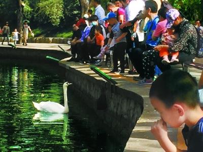 昨天中午记者在北京动物园的水禽湖畔看到,每隔几米就有一块绿牌子,上面投喂水禽是禁止项之一。记者注意到,一些摄影爱好者为等水禽靠近,骄阳下已经满头大汗,他们说不愿意靠投喂食物引水鸟过来,因为园方有规定。