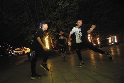 每天晚上7点以后,张浩都会带着学员到雄县政府广场跳曳步舞,电子舞曲带动脚步游弋。距离不远的广场西边,一群老年人板胡、梆子齐上阵,中气十足吼出河北梆子《大登殿》。越来越浓的夜色,把他们清晰地分在两边。
