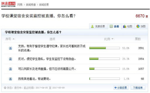 在某门户的在线用户调查中,超过五成的网友支持学校和家长的做法,“支持,有利于督促学生遵守记录,家长也可看到孩子成长的点滴。”