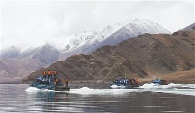 官兵们驾艇巡逻在班公湖上,确保边境安全稳定。