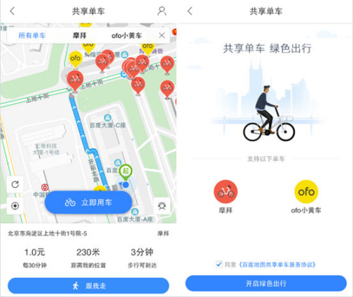 共享单车的接入是此次百度地图版本升级中的重磅,新版本中只需在首页点击路线,即可在“步行”以及“骑行”导航页面看到共享单车入口。地图上会向用户展示距离自己最近的单车位置,点击单车图标后即会出现单车扫码框,轻松完成找车、支付、开锁、取车,甚至是骑行目的地智能导航。目前摩拜、OFO共享单车均已接入,让百度地图一跃成为运力最全的共享单车平台。