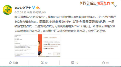 根据多方发布的信息,暗云Ⅲ的主要特点是增加了“占坑设备名”的技术手段对抗安全软件。也就是说,暗云Ⅲ会注册使用360急救箱的设备名,意图阻止中毒电脑运行360急救箱。