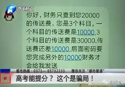 都市频道报道的这起诈骗案中,骗子所说的这个所谓的提分方法,是在考试前给马先生的女儿传送答案,一个科目的传送费是1万元。鹤壁考生就被能考高分打动,很快掉进陷阱。