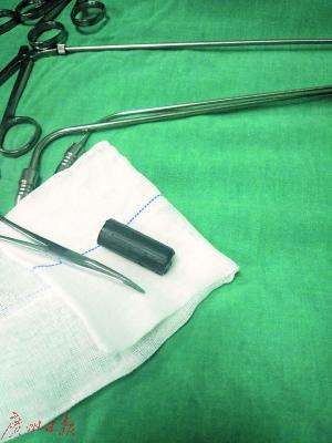 面临着种种的不确定因素,参与手术的医务人员沉着应对,密切配合,副主任医师叶卫东凭着多年来的经验,在支气管镜下找到异物后钳住,并小心翼翼地把握每一步的钳紧力度、旋转角度,慢慢地将这颗“定时炸弹”往外拉。当笔帽被拉到喉部位置,大家都以为可顺利将笔帽取出的时候,这颗“定时炸弹”却卡在了声带位置。