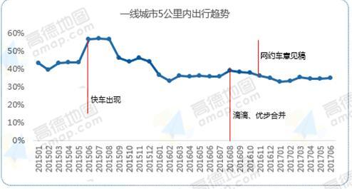 从2016年10月开始,全国近百个城市相继发布网约车新政。随即多个城市拥堵均有小幅下降,政策影响初显。而伴随今年网约车新政的逐步落地实施,城市内短途(5km内)出行比例也在逐渐下降,从2015年6月的57.1%逐步下降到目前的34.7%。