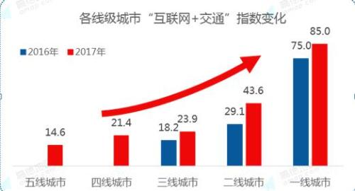 经过近年来对互联网交通管理的探索与发展,“互联网+交通”模式在国内各城市犹如雨后春笋般全面铺开。对比2016年与2017年两年“互联网+交通”城市指数可以发现,“互联网+交通”模式在一线至五线城市均有发展,各地政府以及交通管理部门逐渐重视并积极推动交通智慧化发展,做到了互联互通 、数据驱动、位置精准 、实时响应,实现了更高效的交通管理和更优质的出行服务。