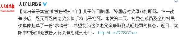 据人民法院报微博消息,辽宁沈阳一男子终日酗酒,醉酒后对父母非打即骂,在一次争吵后,忍无可忍的老父亲伸手将儿子掐死。案发第二天,村委会成员及全村村民便集体起草了一份“求情书”,希望能为这位老父亲争取到从轻处罚的机会。近日,沈阳市中院判处被告人蒋某有期徒刑七年。