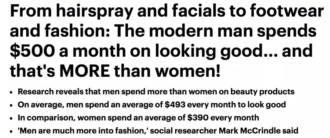 不光中国年轻男性越来越注重外表,据英国卫报报道,一项调查显示,20岁左右的年轻男性平均每月在护肤护发产品上的消费达到近500美元,这也超过了同龄女性的平均水平。