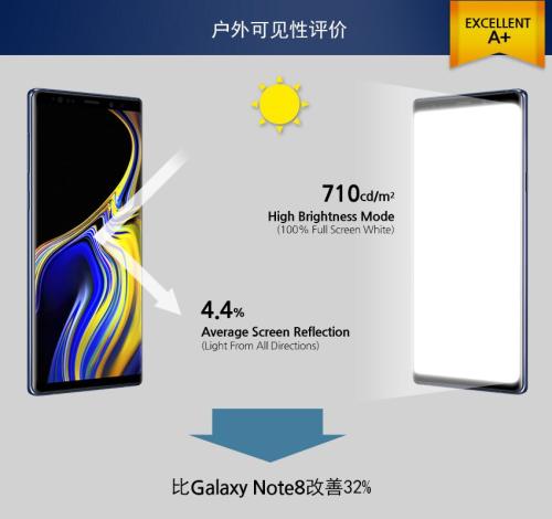 GalaxyNote9的户外可见性比GalaxyNote8提高了32%,一般来说显示屏的户外可见性取决于画面的明亮度以及可视光线的反射率(画面明亮度高,可视光线反射率低的户外可见性最好)。盛夏骄阳时,GalaxyNote9甚至在极高的亮度下也比Note8(560cd/㎡)增加27%的亮度(710cd/㎡)