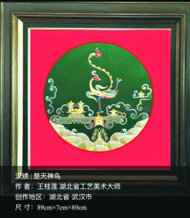 湖北省工艺美术大师王子怡的汉绣作品《楚天神鸟》,取楚文化的代表——凤鸟、楚城、编钟以及江水、祥云等元素构图,采用汉绣传统“平金夹绣”工艺绣制,塑造出楚凤翩翩起舞、祥和自信的形象。她表示,当下非物质文化遗产正呈现蓬勃发展的趋势,对于汉绣来说也意味着竞争,汉绣应坚持“寻根,习艺,思辨”,立足原创,才能真正地发展壮大。