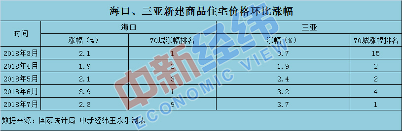 7月份,三亚新建商品房环比涨幅领跑70城为3.7%,海口新建商品房环比涨幅为2.3%。