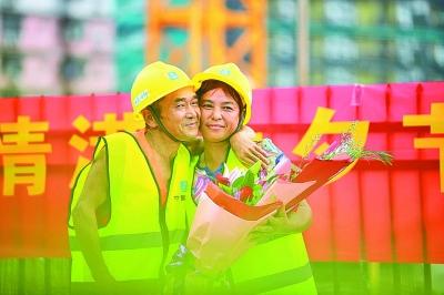 8月15日,深圳,在七夕前夕,中建四局三公司为长期在工地辛勤工作的民工夫妻送上七夕节祝福。光明图片/视觉中国