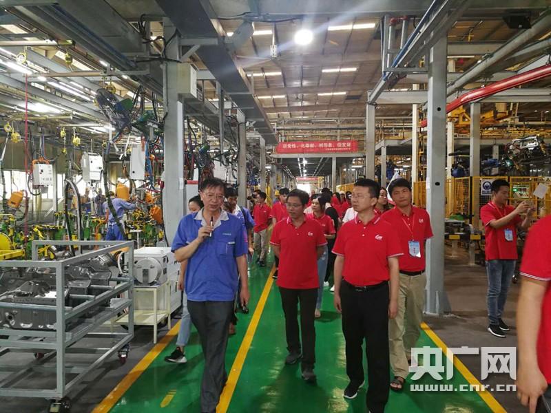 江铃集团新能源汽车有限公司总经理助理李慎国带领记者团参观总装厂并进行讲解,为记者介绍汽车生产过程以及新能源汽车的市场情况。(央广网记者 李澎 摄)