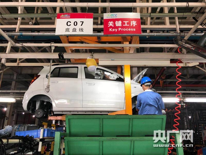 总装厂内,工人正在为新车安装底盘。底盘安装是成车的重要工序,应用了自动化程度较高的AGV循环小车进行安装。(央广网记者 高寒露 摄)