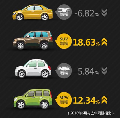 三厢车、SUV、两厢车、MPV消费量占比分别为49.63%、21.59%、16.76%、9.01%,较去年同期相比,三厢车及两厢车消费量占比均出现下跌,同比跌幅分别为6.83%、5.84%;而代表汽车消费升级方向的多用途乘用车SUV、MPV增势强劲,同比增幅分别为18.63%及12.34%,持续增长的原因可归结为改善型需求的增长,人们对消费的优质化和生活的多元化都有了更高要求;随着二孩政策的开放,空间需求升级;这两种车型保值率相对较高,易于转手,反映民众理性消费观念深入。
