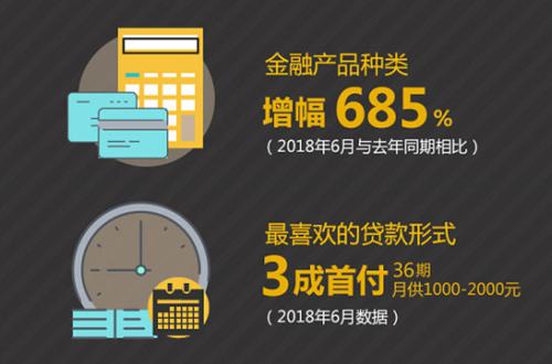 金融作为促进消费升级的重要手段之一,大幅降低了消费门槛,对消费快速增长具有强推动作用。就瓜子二手车平台数据来看,与去年同期相比,金融产品种类由92种迅速扩张至723种,增幅超685%,愈加丰富的金融产品品类,促进金融渗透率大幅提升,普惠特征明显;其中首付三成分36期,月供在1000-2000之间的金融产品备受青睐,综合分析来看,首付及还款压力较小、性价比较高、资金使用更加灵活是其接受度高的主要原因。