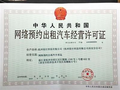 本报讯 (记者 梁璠 见习记者 南江远) 记者22日从西安市出租汽车管理处获悉,22日,杭州优行科技有限公司西安分公司领到《网络预约出租汽车经营许可证》。据悉,这是西安颁发出的首张网约车经营许可证。